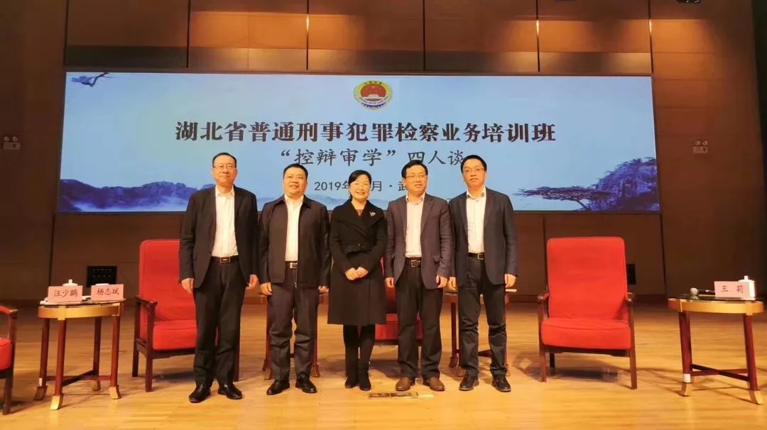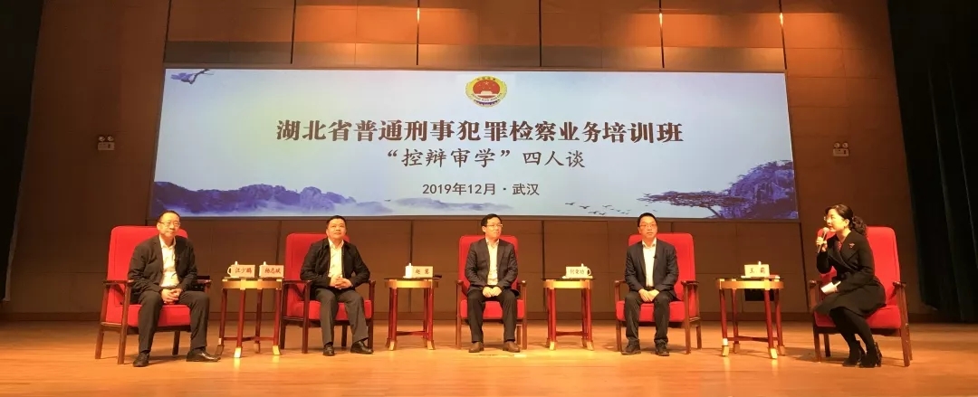 2019年12月10日18:30-21:30,“湖北省普通刑事犯罪檢察業(yè)務(wù)培訓(xùn)班‘控辯審學(xué)’四人談”在國家檢察官學(xué)院湖北分院舉辦,湖北省法學(xué)會律師法學(xué)研究會會長、湖北省律協(xié)刑事法律專業(yè)委員會主任、湖北立豐律師事務(wù)所(以下簡稱“立豐所”)主任汪少鵬應(yīng)邀作為四人談中的“辯”方嘉賓參與了此次會談。受邀參加“四人談”的其他三方嘉賓有:湖北省高級人民法院刑事審判第三庭庭長、全國審判業(yè)務(wù)專家、法學(xué)博士楊志斌,湖北省人民檢察院第一檢察部主任、全國檢察業(yè)務(wù)專家、法學(xué)博士趙慧,武漢大學(xué)法學(xué)院副院長、教授、博士生導(dǎo)師何榮功。來自全省檢察與法院系統(tǒng)的部分業(yè)務(wù)骨干、檢察官學(xué)院部分師資人員、湖北立豐律師事務(wù)所等律所律師共200余人現(xiàn)場旁聽與學(xué)習(xí)。