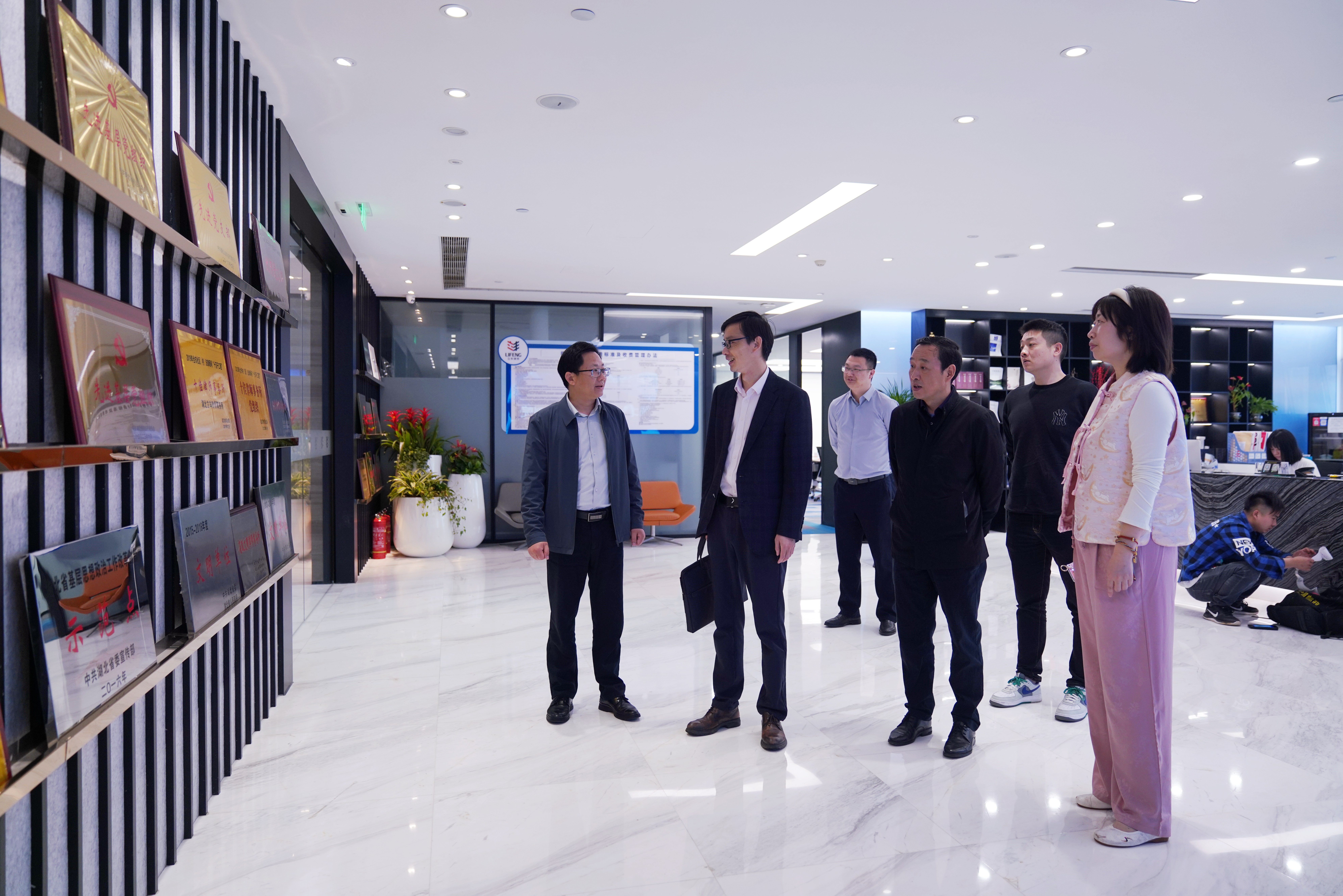 會(huì)前,執(zhí)行主任汪后新帶領(lǐng)法商學(xué)院副院長(zhǎng)牛睿軍參觀了立豐所的辦公區(qū)、休閑區(qū)及榮譽(yù)墻等。,隨后,雙方在立豐所會(huì)議廳座談交流,汪后新對(duì)牛睿軍一行的到來(lái)表示熱烈歡迎,并詳細(xì)介紹了立豐所的發(fā)展歷程、組織構(gòu)架和黨建工作,管委會(huì)副主任夏愛華分享了立豐所的企業(yè)文化和人才培養(yǎng)制度,管委會(huì)副主任何煉高介紹了立豐所對(duì)青年律師的培養(yǎng)和實(shí)習(xí)見習(xí)等工作,法商學(xué)院副院長(zhǎng)牛睿軍介紹了法商學(xué)院基本情況。雙方圍繞法學(xué)專業(yè)人才培養(yǎng)、學(xué)科建設(shè)及校企合作等話題進(jìn)行深入交流。
