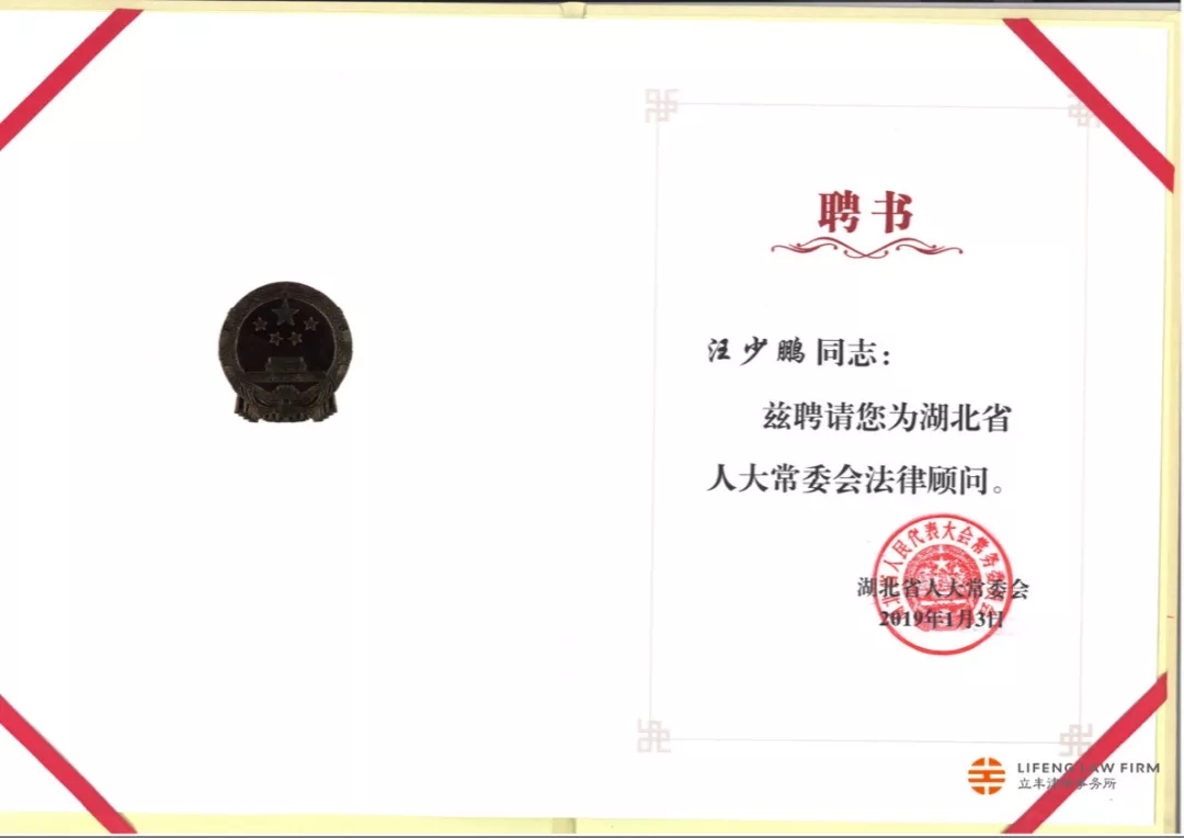 湖北省法學(xué)會律師法學(xué)研究會會長、湖北省律協(xié)刑事法律專業(yè)委員會主任、湖北立豐律師事務(wù)所首席合伙人、主任汪少鵬等26名黨委、政府、監(jiān)察、司法、院校、律師等領(lǐng)域的法律人士受聘擔(dān)任省人大常委會法律顧問。上述受聘法律顧問人員的確定,系經(jīng)過相關(guān)部門擇優(yōu)推薦,由省人大進行嚴(yán)格考察與審核,并最終經(jīng)省人大黨組會議討論通過。與汪少鵬律師一同受聘擔(dān)任省人大常委會法律顧問的共有三名律師。